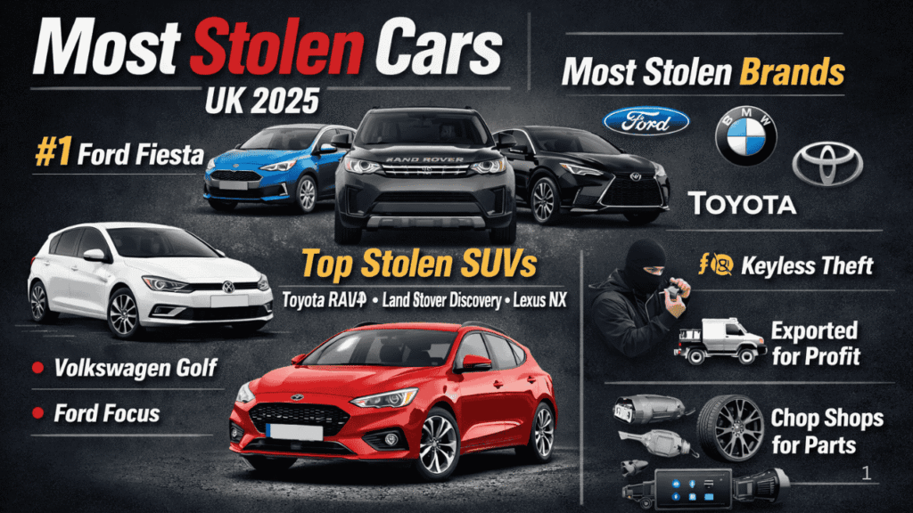 Car theft in the UK is still a serious issue in 2025, and the same familiar names keep appearing in the rankings. The Ford Fiesta remains the UK’s most stolen car, while popular hatchbacks like the Golf, Focus, and Corsa continue to be targeted. Meanwhile, high-value SUVs such as the Toyota RAV4, Land Rover Discovery, and Lexus NX are attractive to organised crime groups.